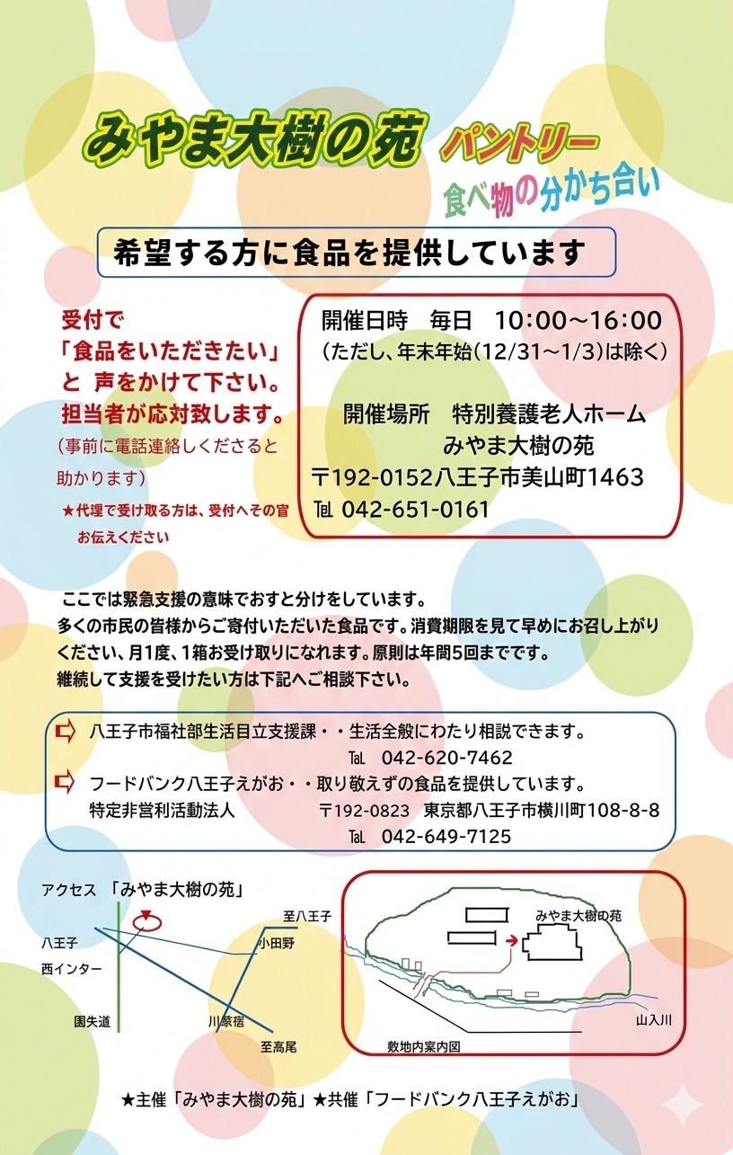 このたび、みやま大樹の苑ではNPO法人フードバンク八王子えがお様と協力のもと「フードパントリー」の活動をはじめました。